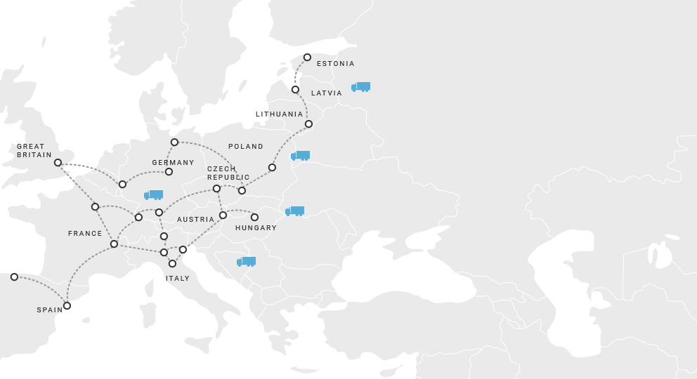 We provide all logistics and cargo distribution services in the Baltic region. We carry full and partial cargoes from Western Europe to the Baltic and CIS countries. From the Baltic region and the CIS countries to Western Europe. We also transport freight in Western Europe.